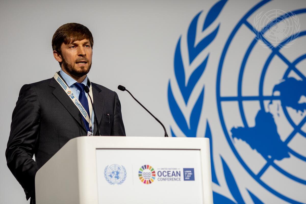 A representative of the Russian Federation addresses the United Nations 2022 Ocean Conference in Lisbon, Portugal.