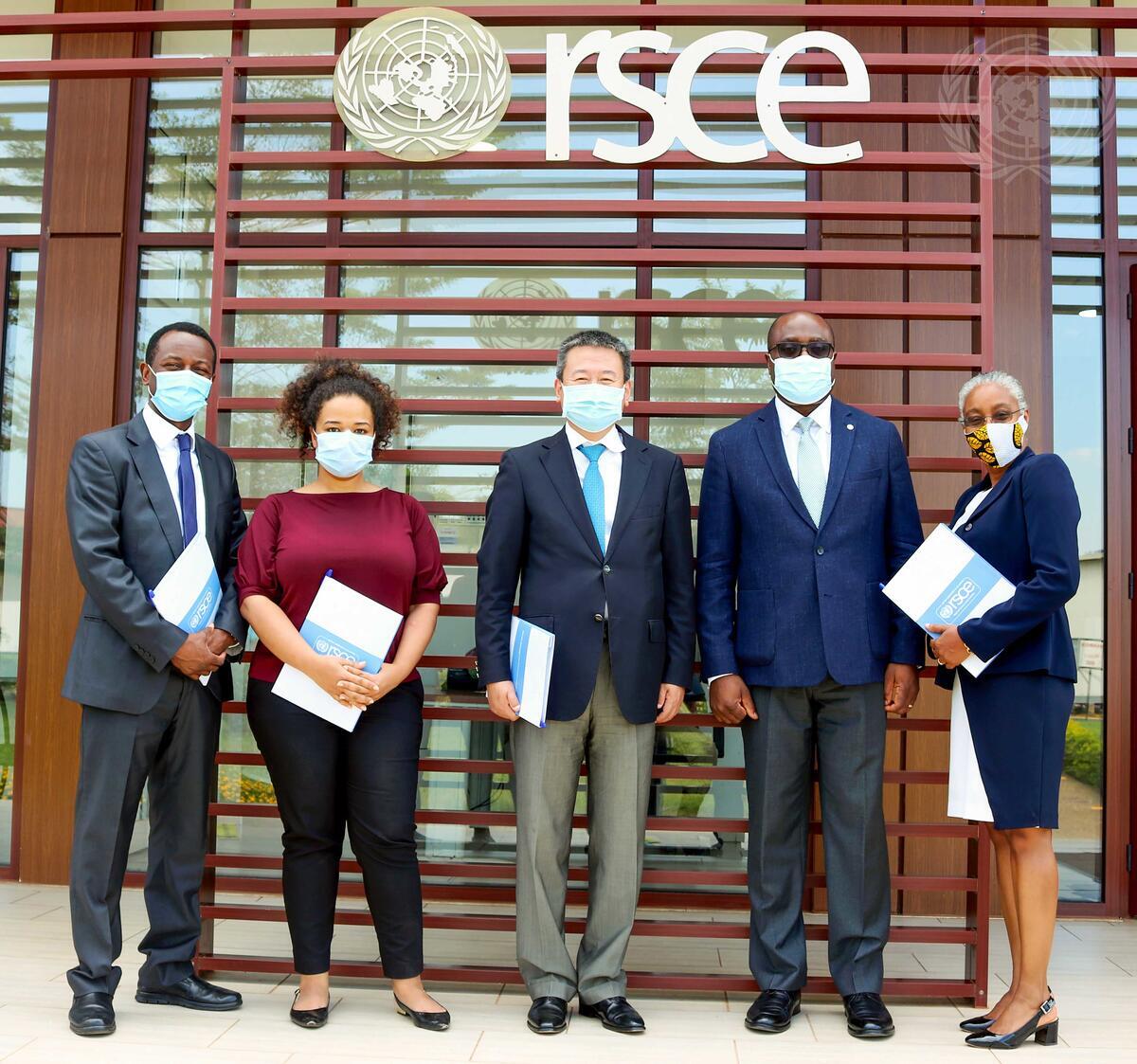 Huang Xia (centre), Special Envoy of the Secretary-General for the Great Lakes region, visits the UN Regional Service Centre Entebbe (RSCE) and meets with Paulin Djomo (second from right), Director of the Regional Service Centre Entebbe.