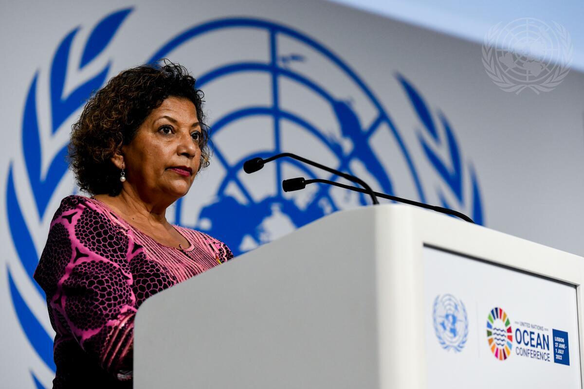 A representative of Mozambique addresses the United Nations 2022 Ocean Conference in Lisbon, Portugal.
