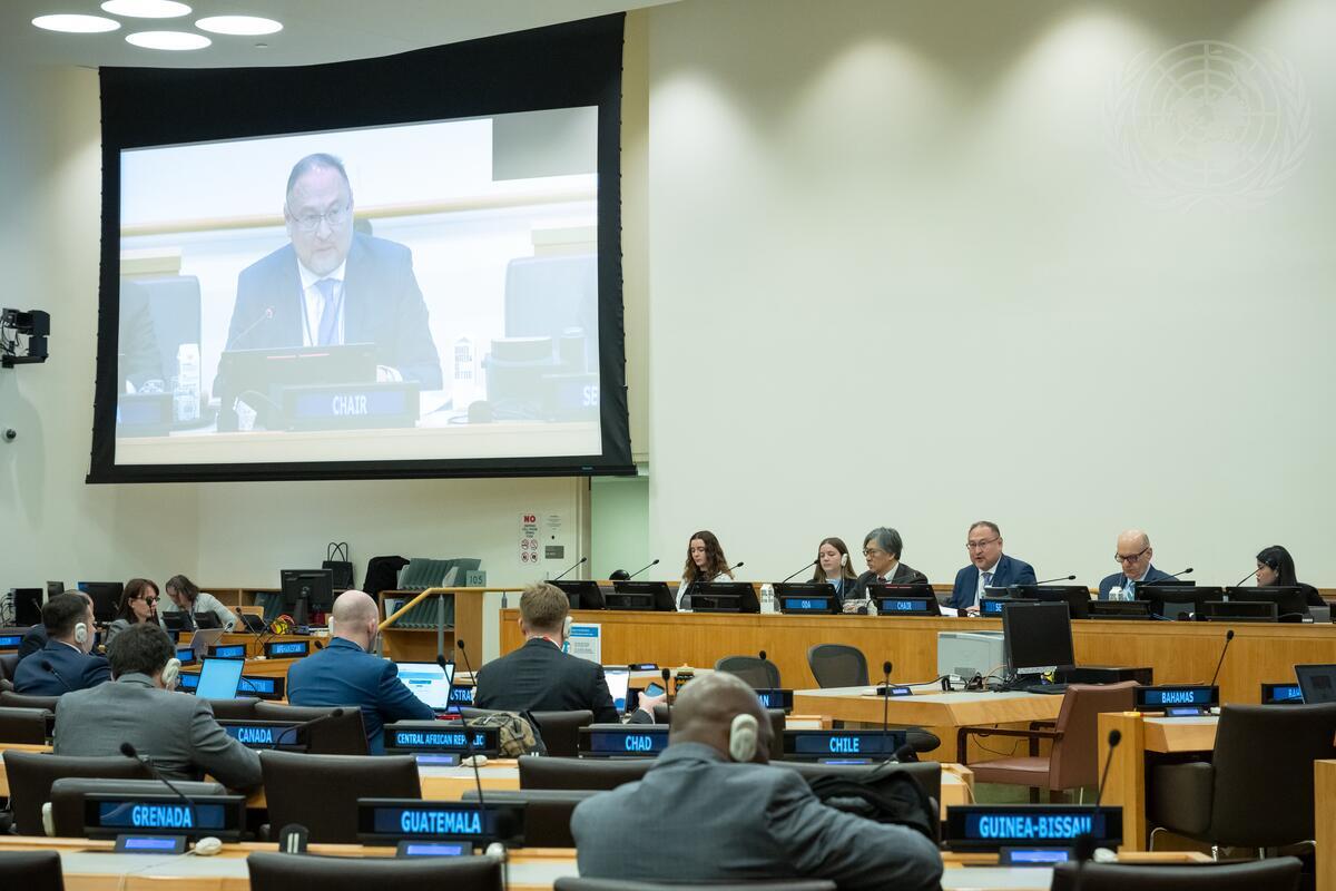 A wide view of the Disarmament Commission substantive session of 2023 (3-21 April). On the screen is Akan Rakhmetullin, Permanent Representative of the Republic of Kazakhstan to the United Nations.
