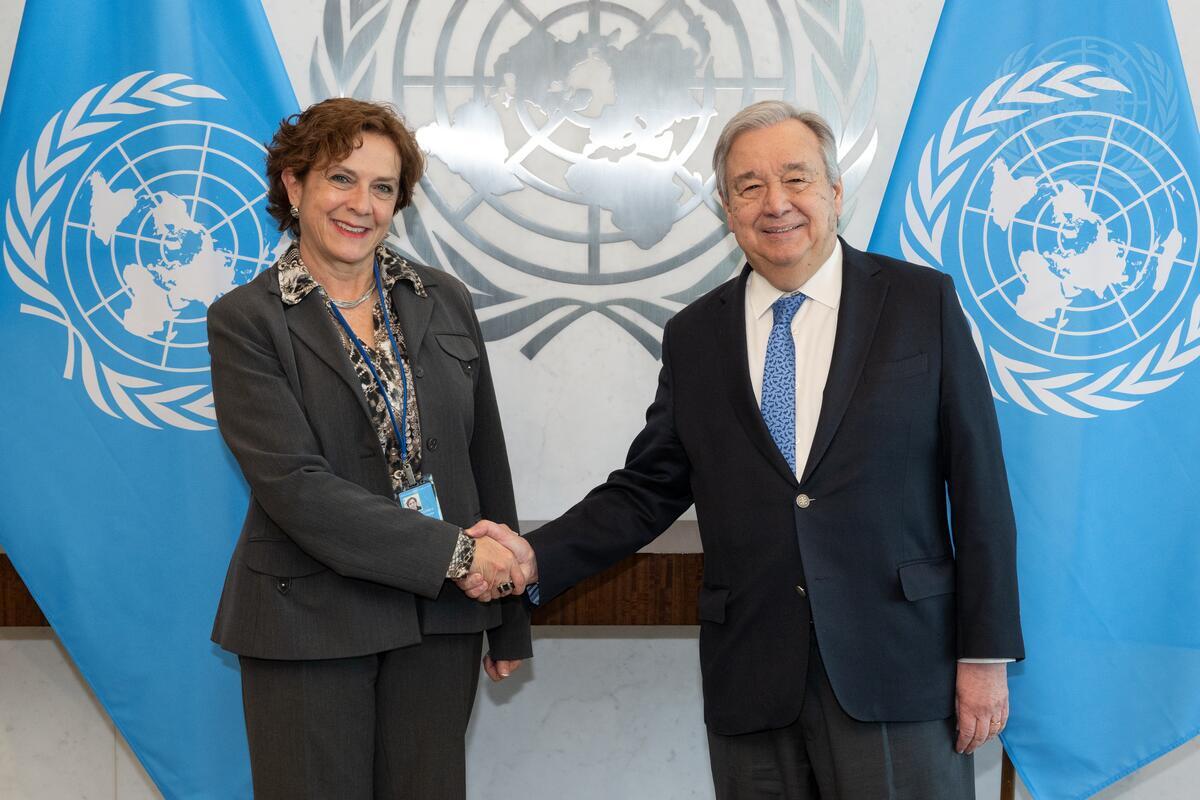 Secretary-General António Guterres (right) meets with María Isabel Salvador, Special Representative of the Secretary-General for Haiti and Head of the United Nations Integrated Office in Haiti.