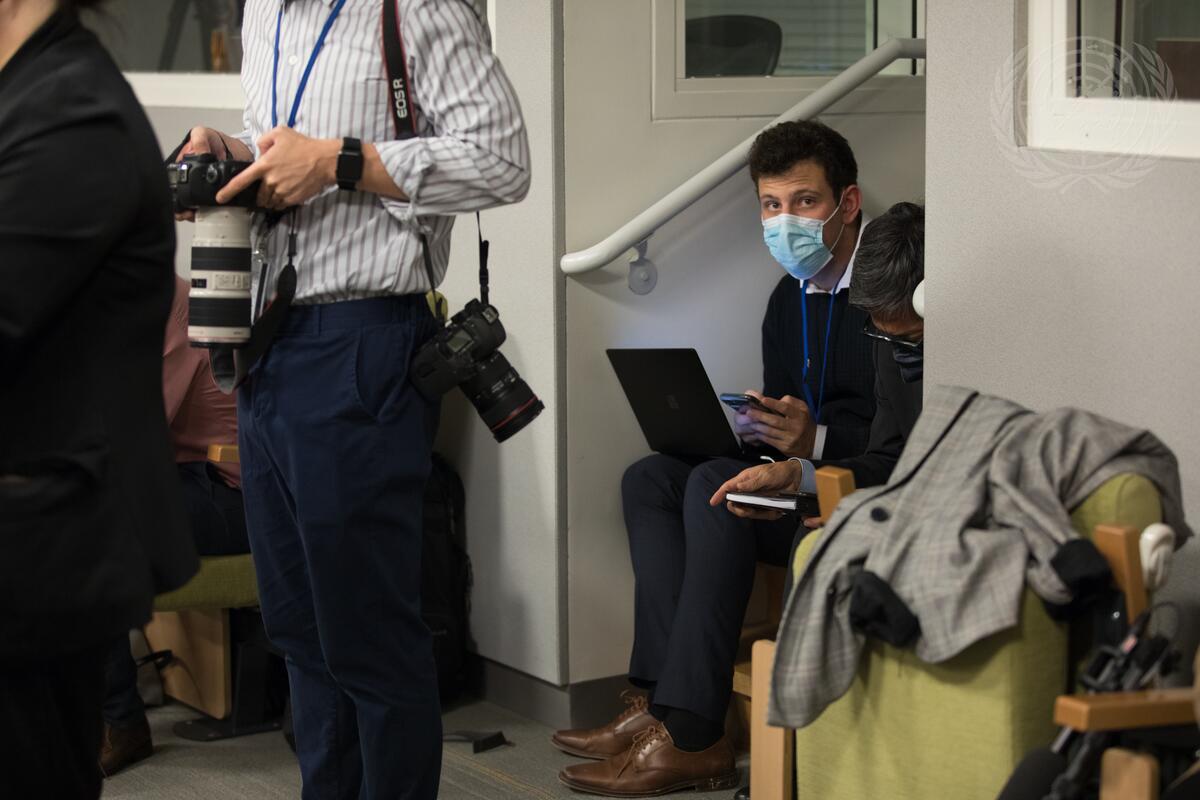 A view of reporters covering the press conference by Justin Trudeau, Prime Minister of Canada, during the general debate of the General Assembly’s seventy-seventh session.