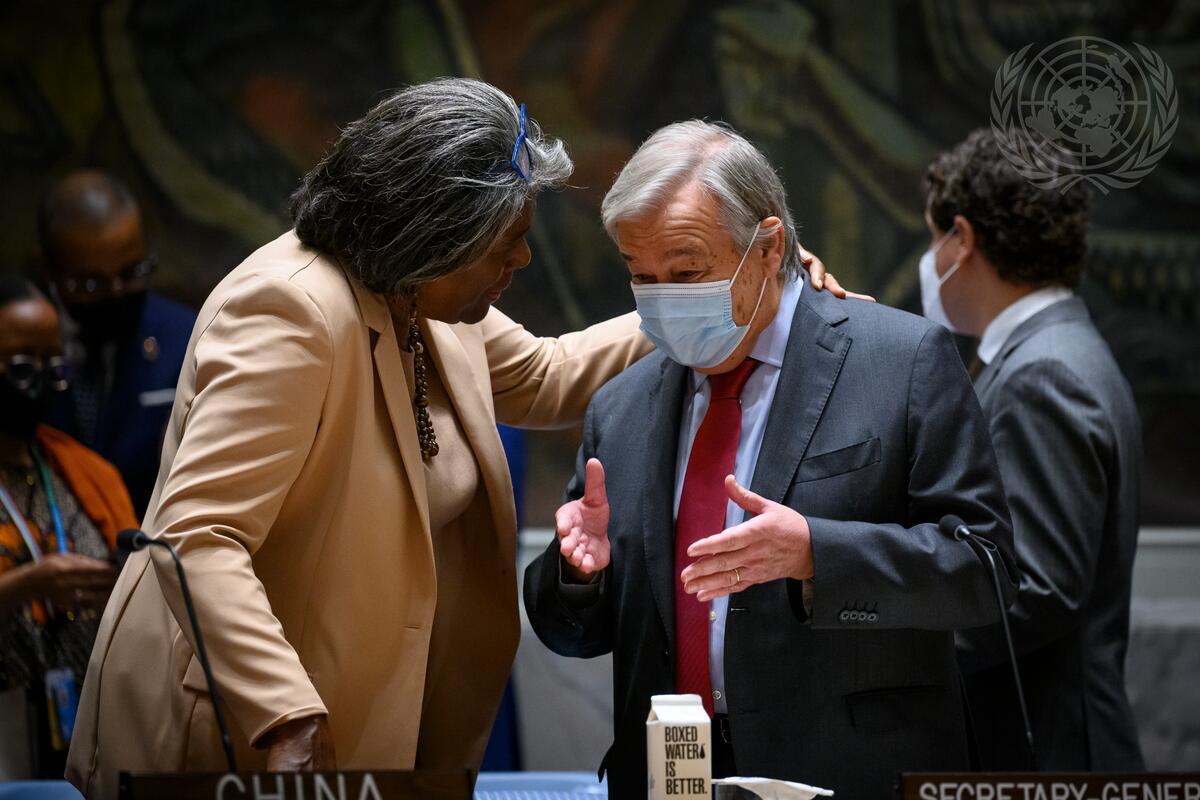 Secretary-General António Guterres (right) speaks with Linda Thomas-Greenfield, Permanent Representative of the United States to the United Nations, ahead of the Security Council meeting on maintenance of peace and security of Ukraine.