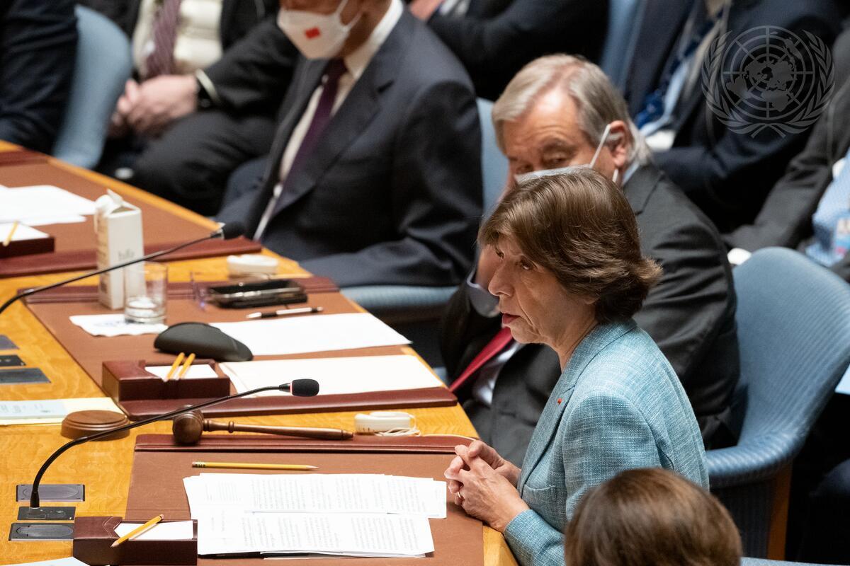 Catherine Colonna (centre), Minister for Europe and Foreign Affairs of the Republic of France and President of the Security Council for the month of September, chairs the Security Council meeting on maintenance of peace and security of Ukraine.