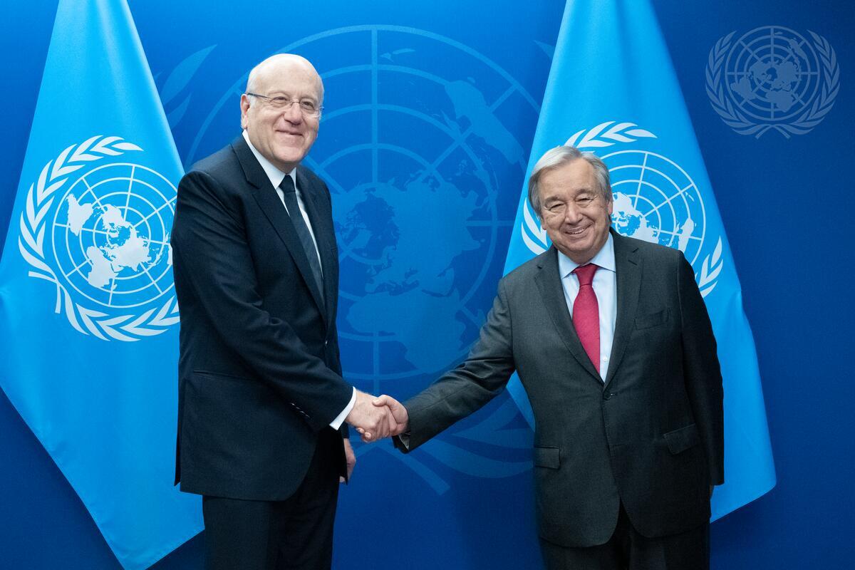 Secretary-General António Guterres (right) meets with Mohammad Najib Azmi Mikati, President of the Council of Ministers of the Lebanese Republic.