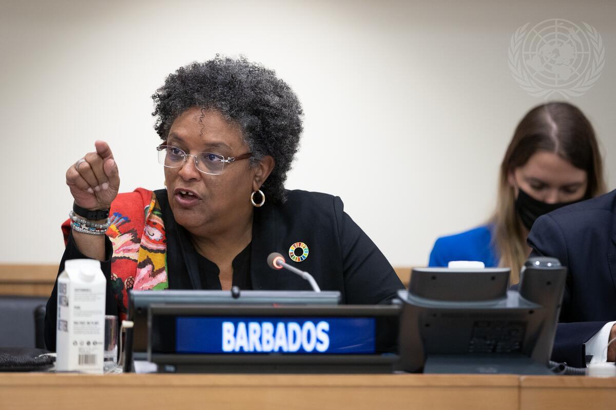 Mia Amor Mottley, Prime Minister of Barbados, addresses the meeting on "Partnering for Action: Implementation of the Global Accelerator on Jobs and Social Protection for Just Transitions in the Complex Setting of Overlapping Crises" at UN Headquarters.