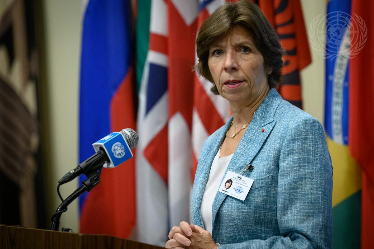 Catherine Colonna, Minister for Europe and Foreign Affairs of the Republic of France and President of the Security Council for the month of September, briefs reporters ahead of the Security Council meeting on maintenance of peace and security of Ukraine.