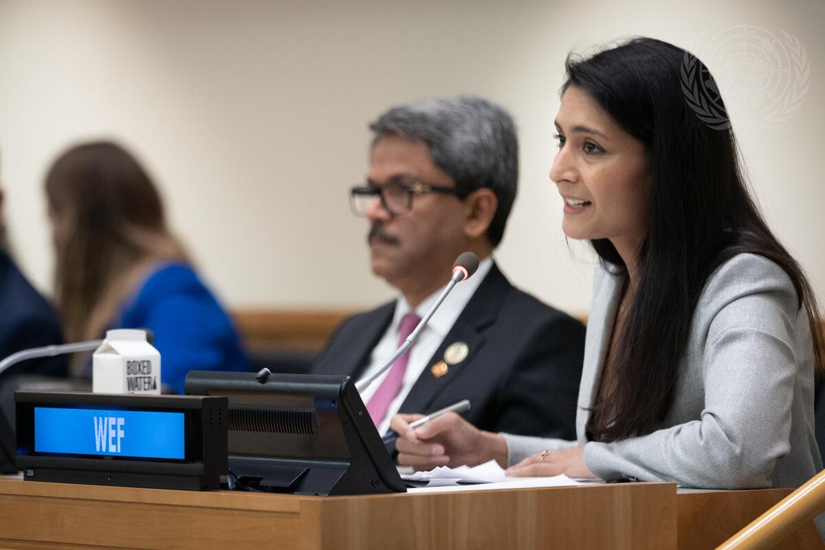 Saadia Zahidi, Managing Director of the World Economic Forum, addresses the meeting on “Partnering for Action: Implementation of the Global Accelerator on Jobs and Social Protection for Just Transitions in the Complex Setting of Overlapping Crises” held on the sidelines of the seventy-seventh session of the United Nations General Assembly.