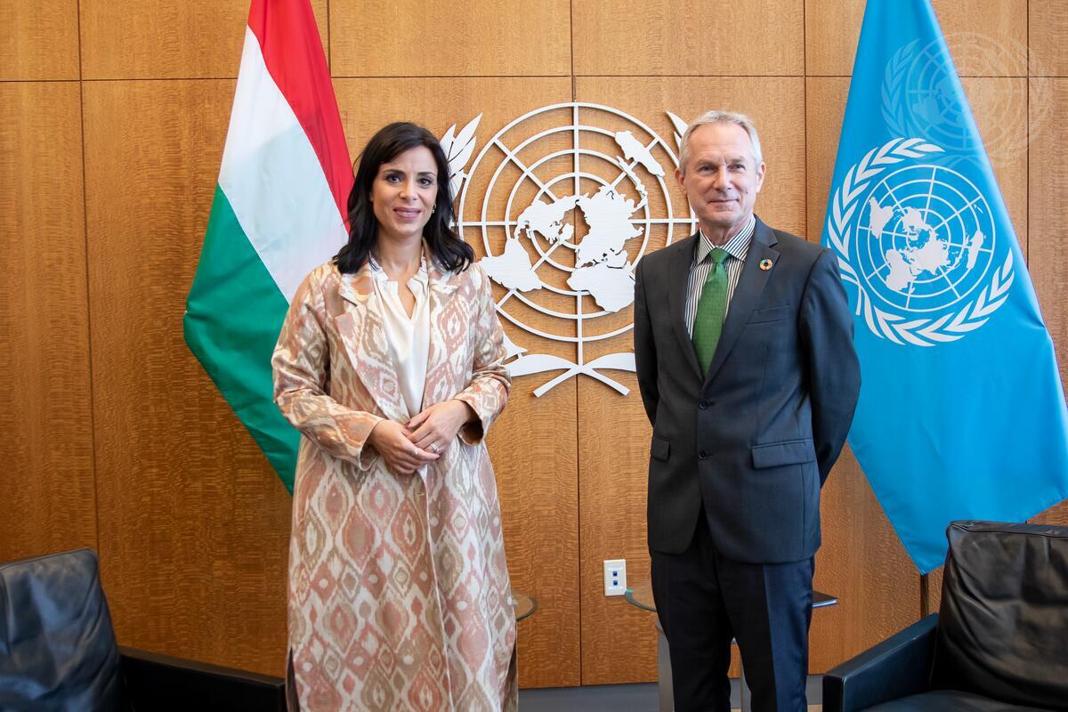 Csaba Kőrösi (right), President of the seventy-seventh session of the United Nations General Assembly, meets with Dominique Hasler, Minister for Foreign Affairs, Education, and Sport of the Principality of Liechtenstein.