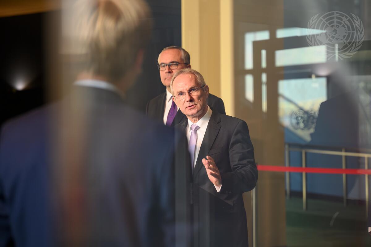 Csaba Kőrösi (centre), President of the seventy-seventh session of the United Nations General Assembly, accompanied by Michal Mlynar (behind President), Permanent Representative of Slovakia to the United Nations, briefs journalists following the 36th plenary meeting on Security Council reform.
