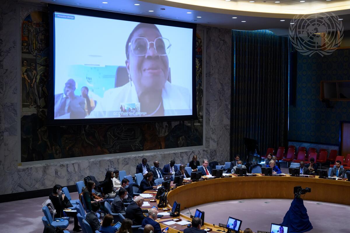 Florentina Adenike Ukonga (on screen), Executive Secretary of the Gulf of Guinea Commission, briefs the Security Council meeting on peace and security in Africa. The Council heard a report of the Secretary-General on the situation of piracy and armed robbery at sea in the Gulf of Guinea and its underlying causes.