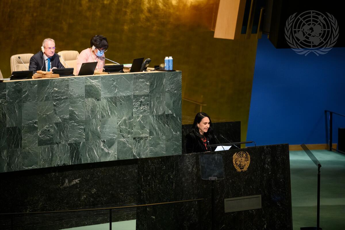 At left at dais is Csaba Kőrösi, President of the seventy-seventh session of the United Nations General Assembly, and at right is Ruth de Miranda, Director of the General Assembly and Economic and Social Council (ECOSOC) Affairs Division of the Department of General Assembly and Conference Management (DGACM).