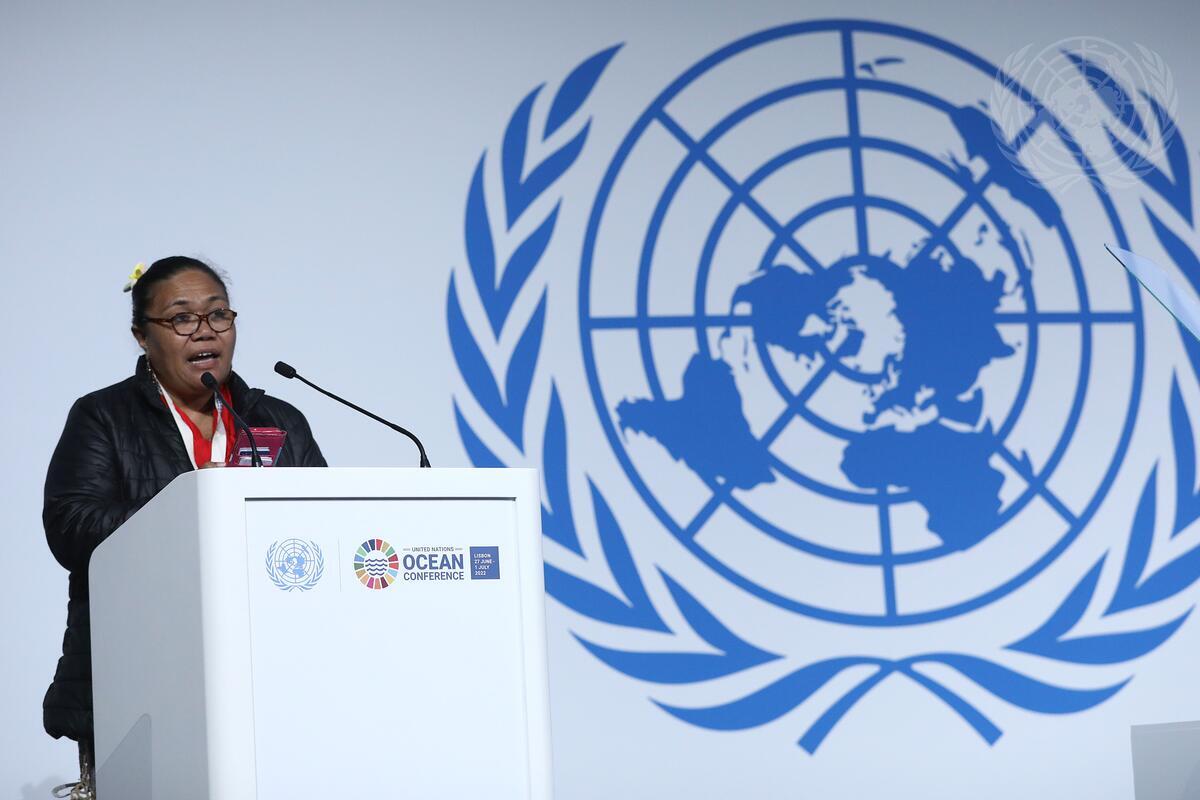 Caption Description A representative of the International Catholic Charities addresses the United Nations 2022 Ocean Conference in Lisbon, Portugal.