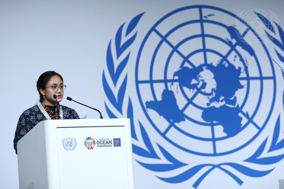 A representative of the Eco International Council addresses the United Nations 2022 Ocean Conference in Lisbon, Portugal.