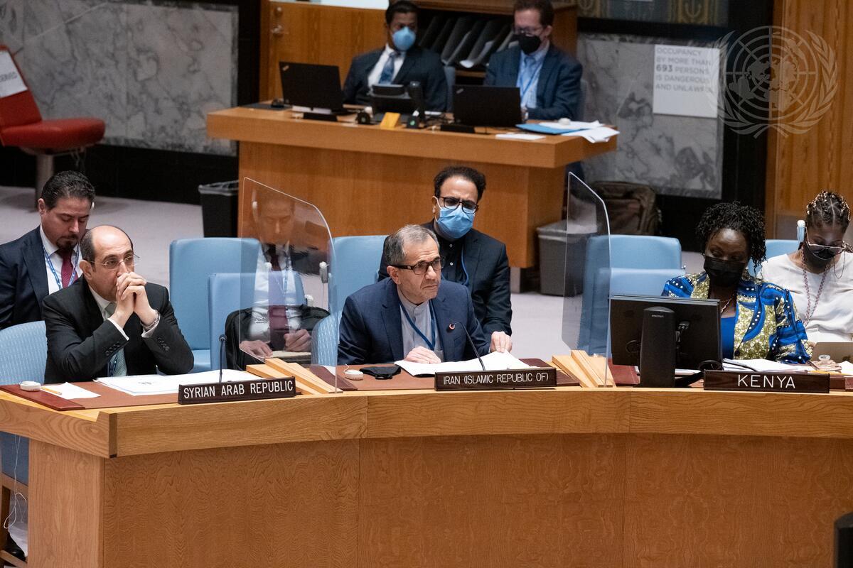 Majid Takht Ravanchi (centre), Permanent Representative of the Islamic Republic of Iran to the United Nations, addresses the Council meeting on the situation in the Middle East (Syria). At left is Bassam Sabbagh, Permanent Representative of the Syrian Arab Republic to the United Nations.