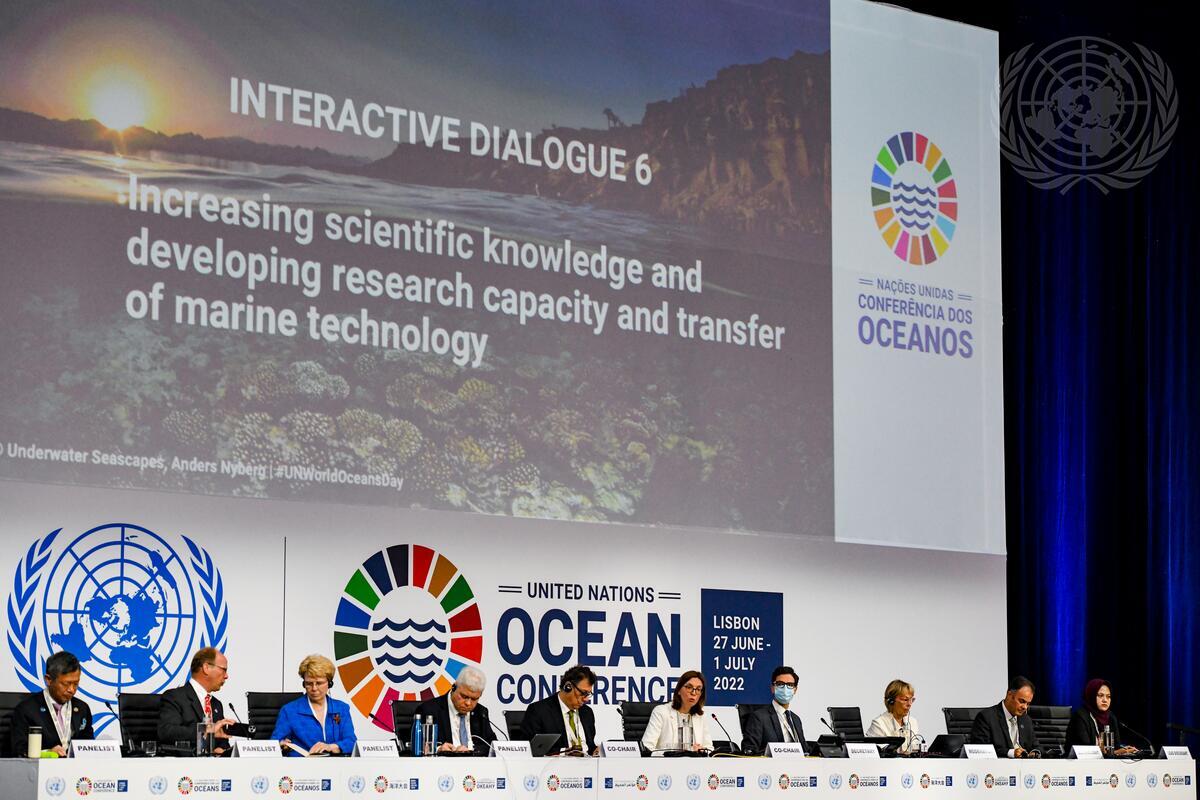 A view of the interactive dialogue on "Increasing scientific knowledge and developing research capacity and transfer of marine technology" during the United Nations 2022 Ocean Conference in Lisbon, Portugal.
