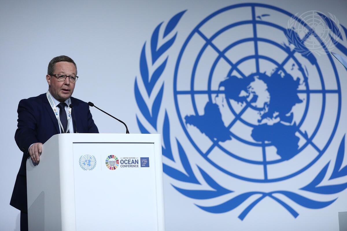 A representative of Finland addresses the United Nations 2022 Ocean Conference in Lisbon, Portugal.