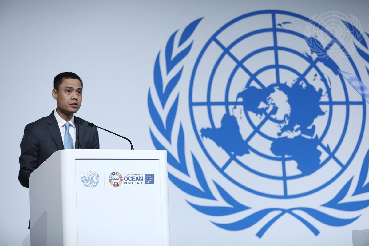 A representative of the Socialist Republic of Viet Nam addresses the United Nations 2022 Ocean Conference in Lisbon, Portugal.