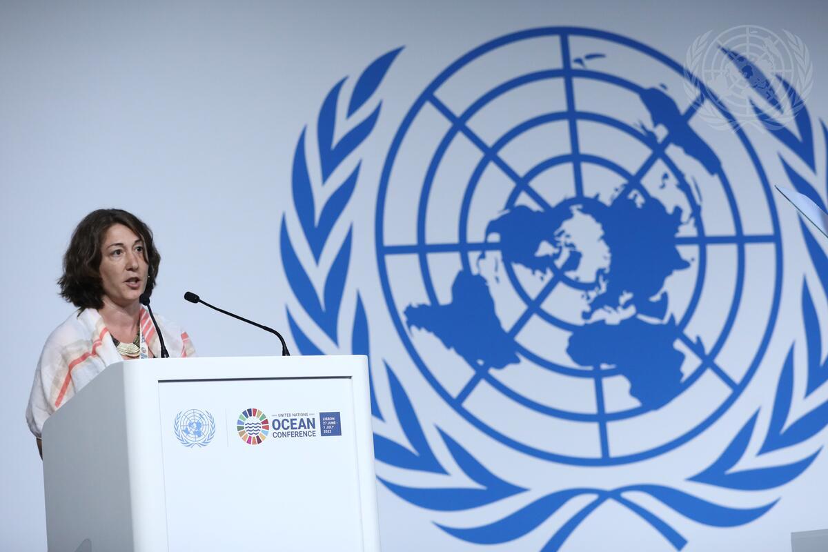 A representative of Ocean Care addresses the United Nations 2022 Ocean Conference in Lisbon, Portugal.