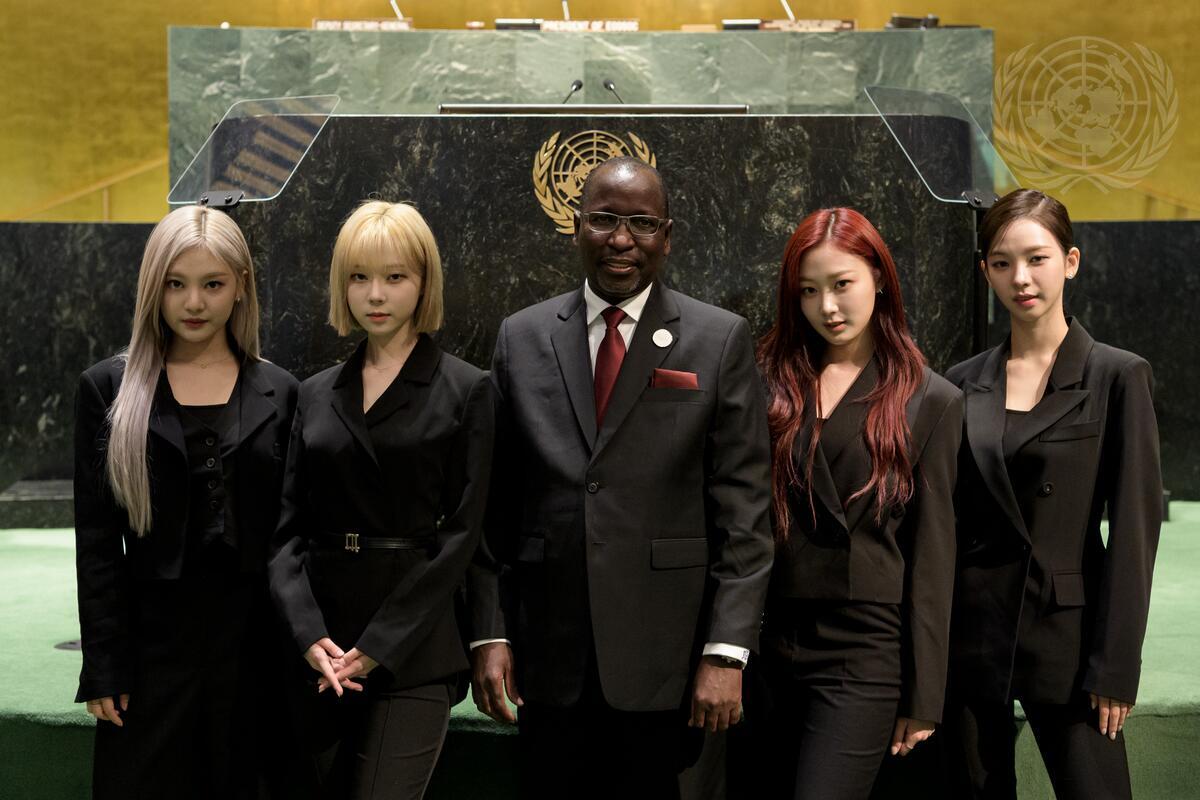 Collen Vixen Kelapile (centre), President of the Economic and Social Council (ECOSOC), poses for a photo with the K-pop group aespa, during the high-level Political Forum on sustainable development convened under the auspices of the Economic and Social Council 2022 session (5-15 July). The Forum is held under the theme: “Building back better from the coronavirus disease (COVID-19) while advancing the full implementation of the 2030 Agenda for Sustainable Development”.