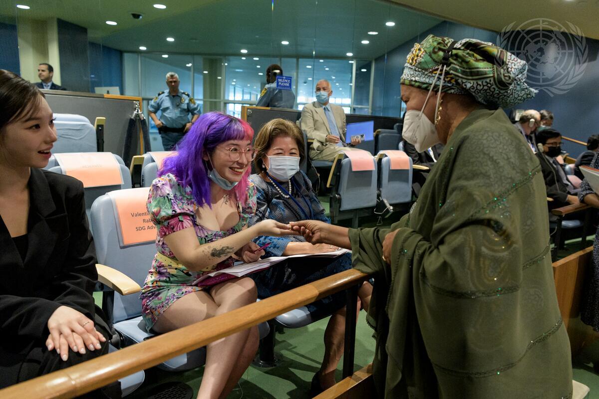 Deputy Secretary-General Amina Mohammed greets Valentina Munoz Rabanal, Sustainable Development Goals Advocate, youth feminist activist and digital rights advocates from Chile, ahead of the high-level Political Forum on sustainable development convened under the auspices of the Economic and Social Council 2022 session (5-15 July). The Forum is held under the theme: “Building back better from the coronavirus disease (COVID-19) while advancing the full implementation of the 2030 Agenda for Sustainable Development”.