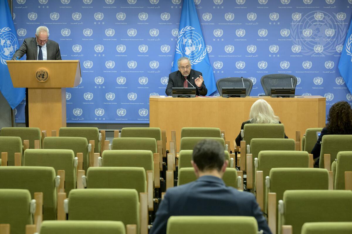 César Núñez (at dais), Director of the UNAIDS New York Office, briefs reporters ahead of World AIDS Day (1 December). At left at podium is Stéphane Dujarric, Spokesperson for the Secretary-General.