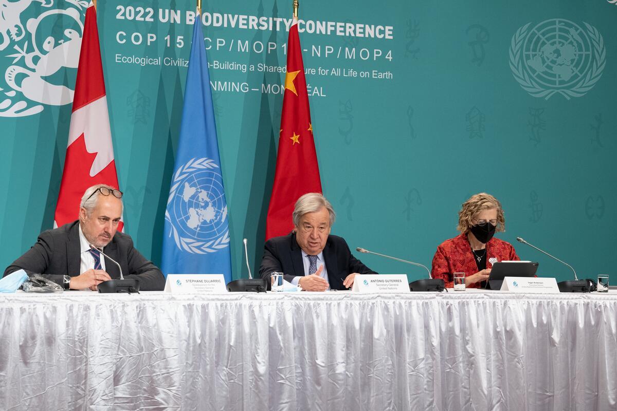 Secretary-General António Guterres (centre) and Inger La Cour Andersen (right), Executive Director of the United Nations Environment Programme (UNEP), holds a press conference on the side of the fifteenth meeting of the Conference of Parties to the Convention on Biological Diversity (COP15) in Montreal, Canada. At left is Stéphane Dujarric, Spokesperson for the Secretary-General.