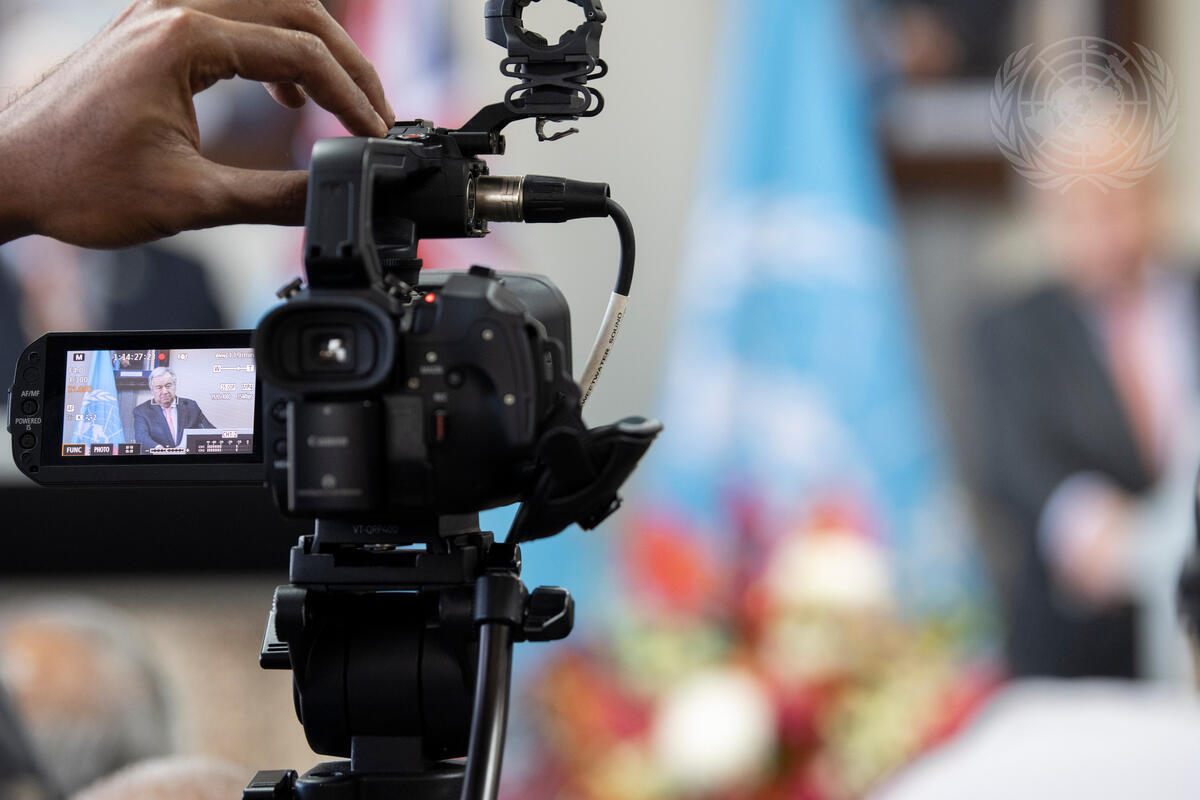 Secretary-General António Guterres (on screen) holds a joint press conference with Josaia Voreqe Bainimarama (not pictured), Prime Minister and Minister for Itaukei Affairs of the Republic of Fiji.
