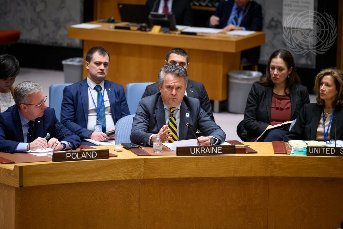 Sergiy Kyslytsya (centre), Permanent Representative of Ukraine to the United Nations, addresses the Security Council meeting on maintenance of peace and security of Ukraine.
