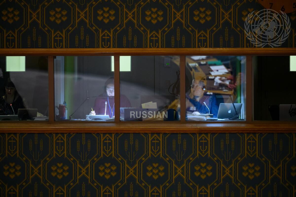 A view of the Russian interpretation booth during the Security Council meeting on maintenance of peace and security of Ukraine.