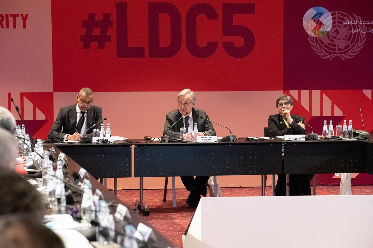 Secretary-General António Guterres (center) delivers remarks at the High-level event entitled “A decade of UN Action to support LDCs” with Principals of the UN System. The event is part of the Fifth United Nations Conference on the Least Developed Countries (LDC5) taking place in Doha, Qatar from 5 to 9 March, 2023.