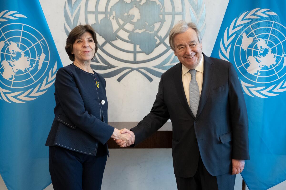 Secretary-General António Guterres (right) meets with Catherine Colonna, Minister for Europe and Foreign Affairs of France.