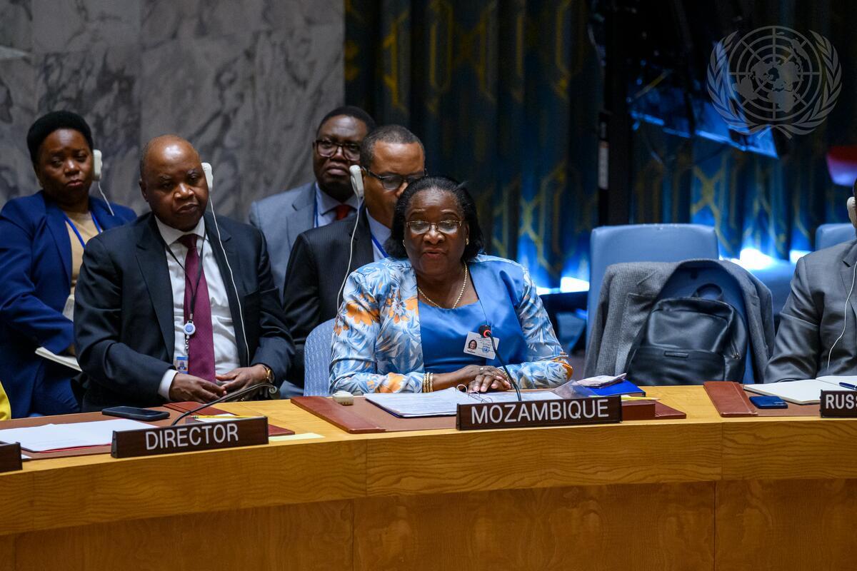 Veronica Nataniel Macamo Dlhovo (at table), Minister for Foreign Affairs and Cooperation of Mozambique, addresses the Security Council meeting on threats to international peace and security, with a focus on Sea-level rise and its implications for international peace and security.