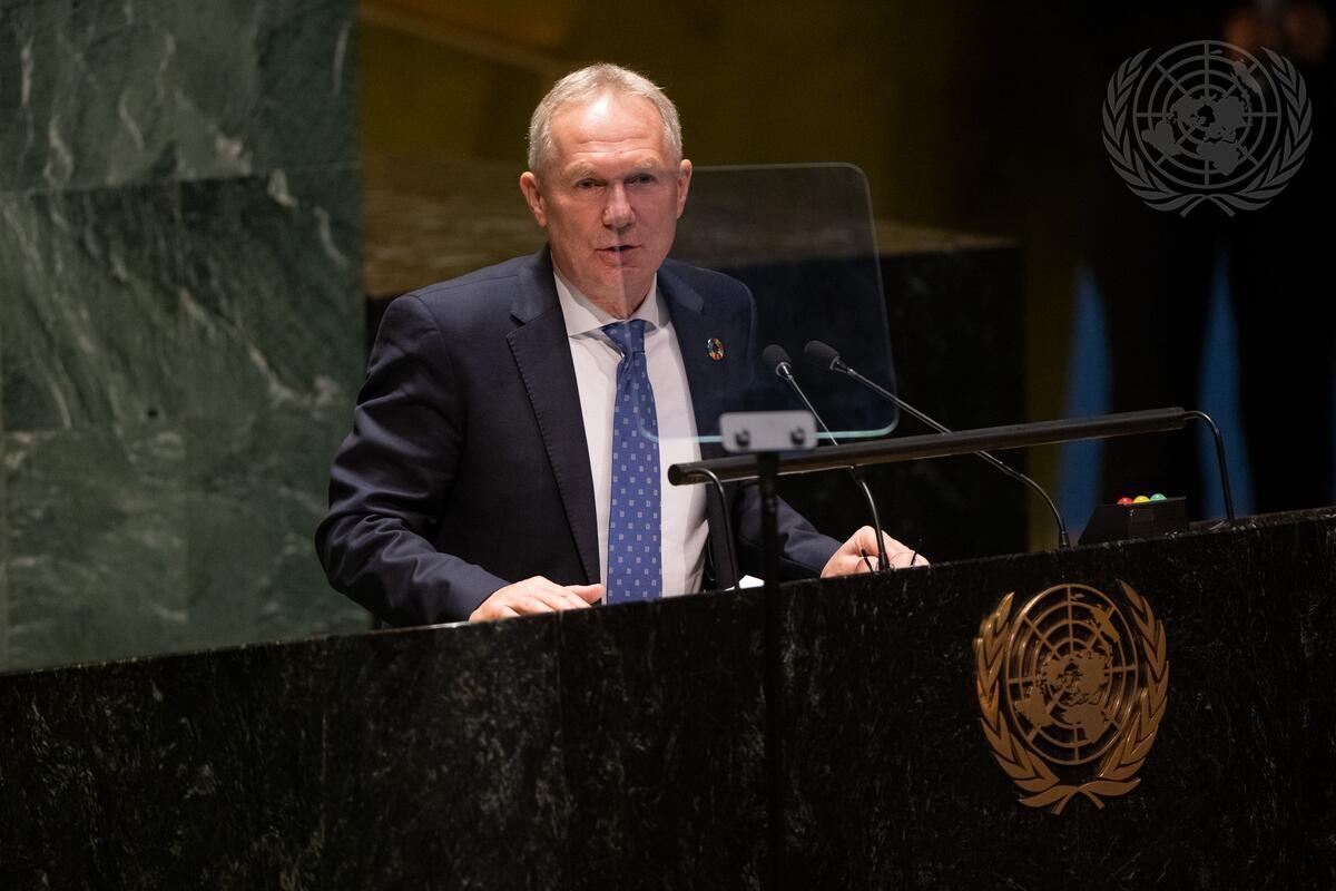 Csaba Kőrösi, President of the seventy-seventh session of the United Nations General Assembly, addresses the informal General Assembly meeting of the plenary to hear a briefing by the Secretary-General on the report “Our Common Agenda”.