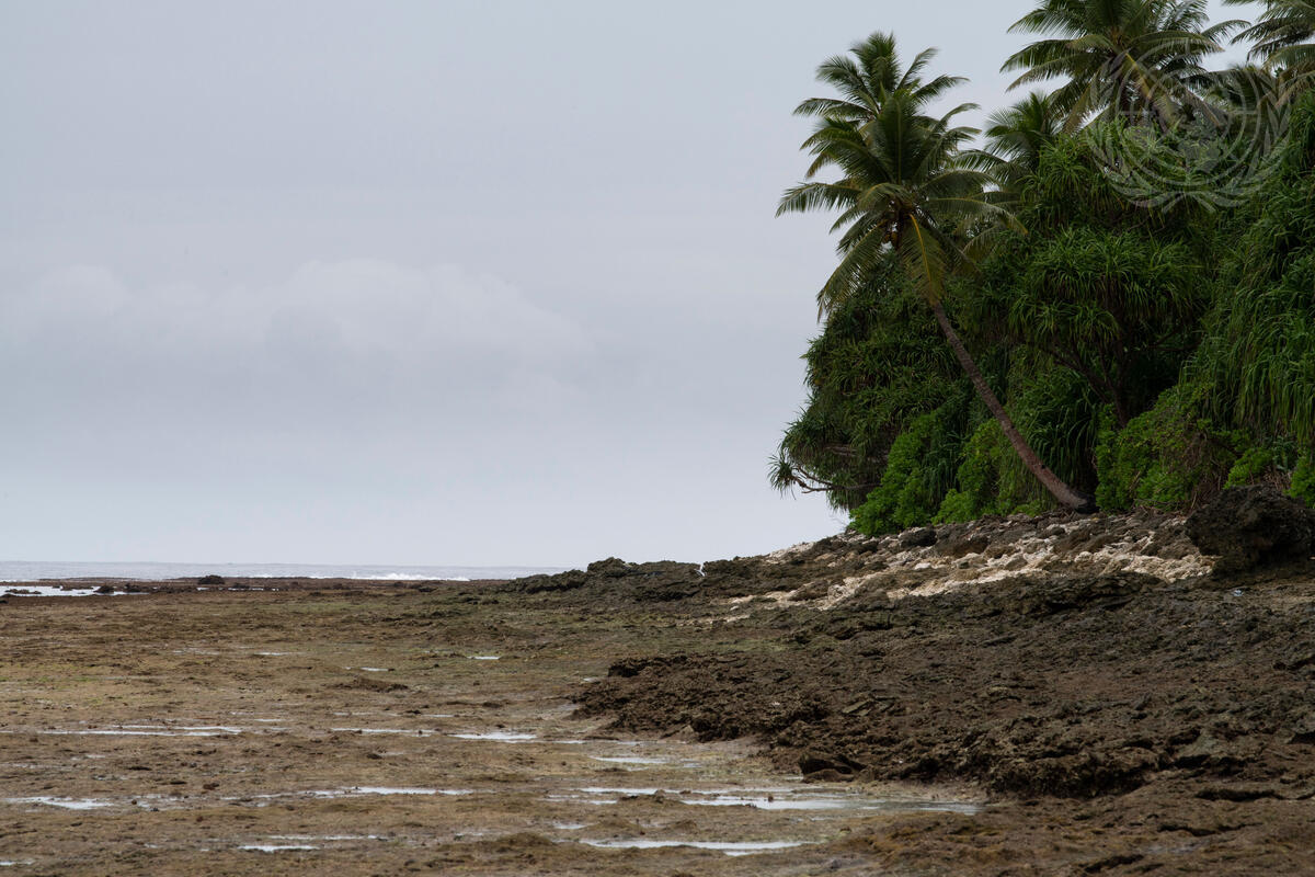 A view of a causeway in Tuvalu where, at high tide, water flows from one side of the island over the causeway to the other side.
