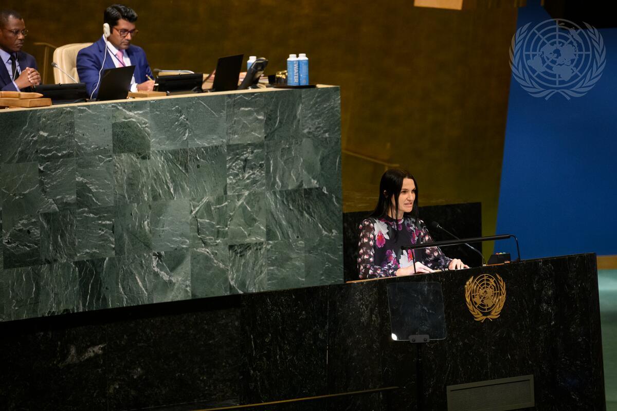 Mirjam Bierling (at podium), First Secretary of the Permanent Mission of Norway to the United Nations, introduces a draft resolution on “Sustainable fisheries, including through the 1995 Agreement for the Implementation of the Provisions of the United Nations Convention on the Law of the Sea of 10 December 1982 relating to the Conservation and Management of Straddling Fish Stocks and Highly Migratory Fish Stocks, and related instruments" to the General Assembly meeting.