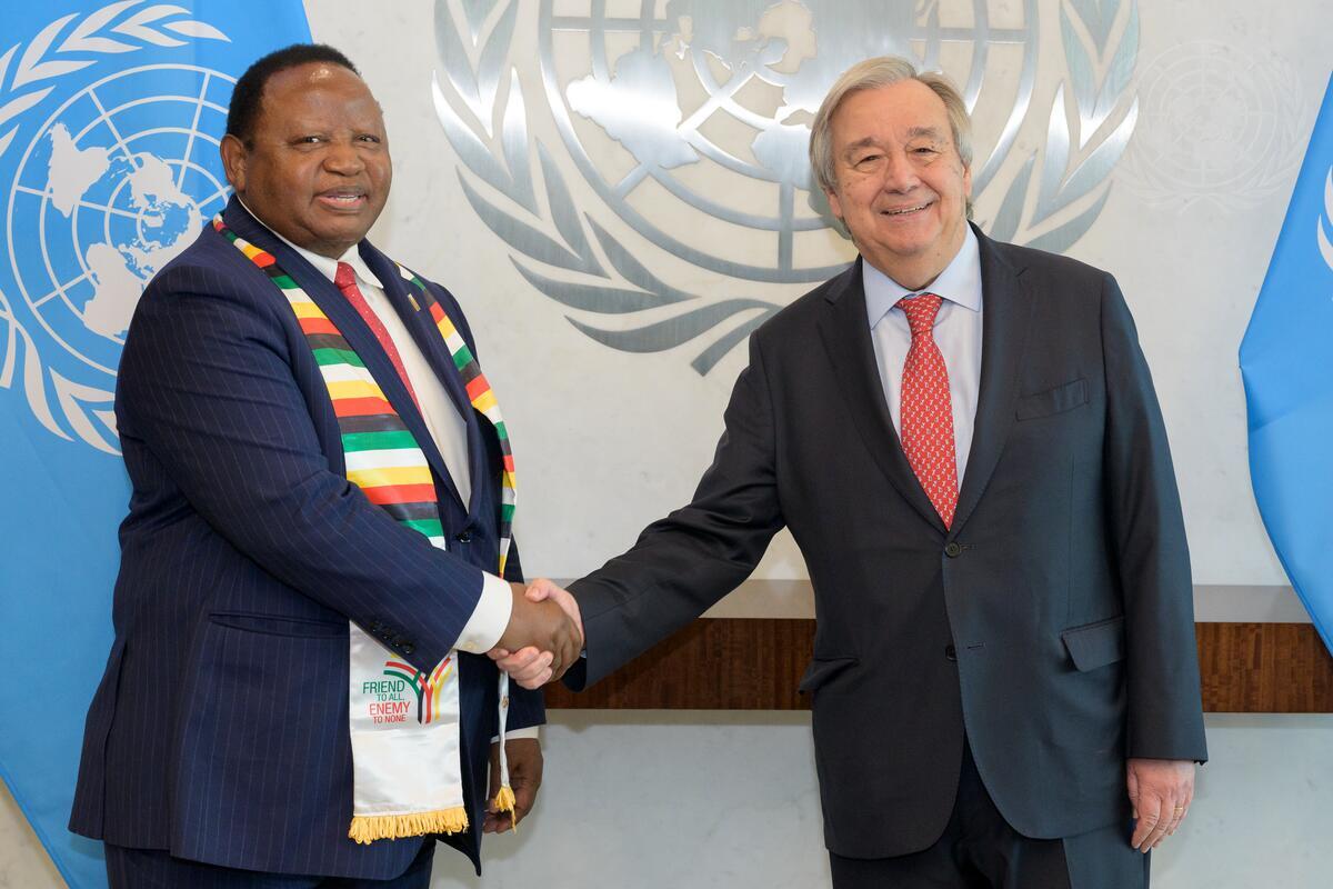 Secretary-General António Guterres (right) meets with Frederick Makamure Shava, Minister for Foreign Affairs and International Trade of Zimbabwe.