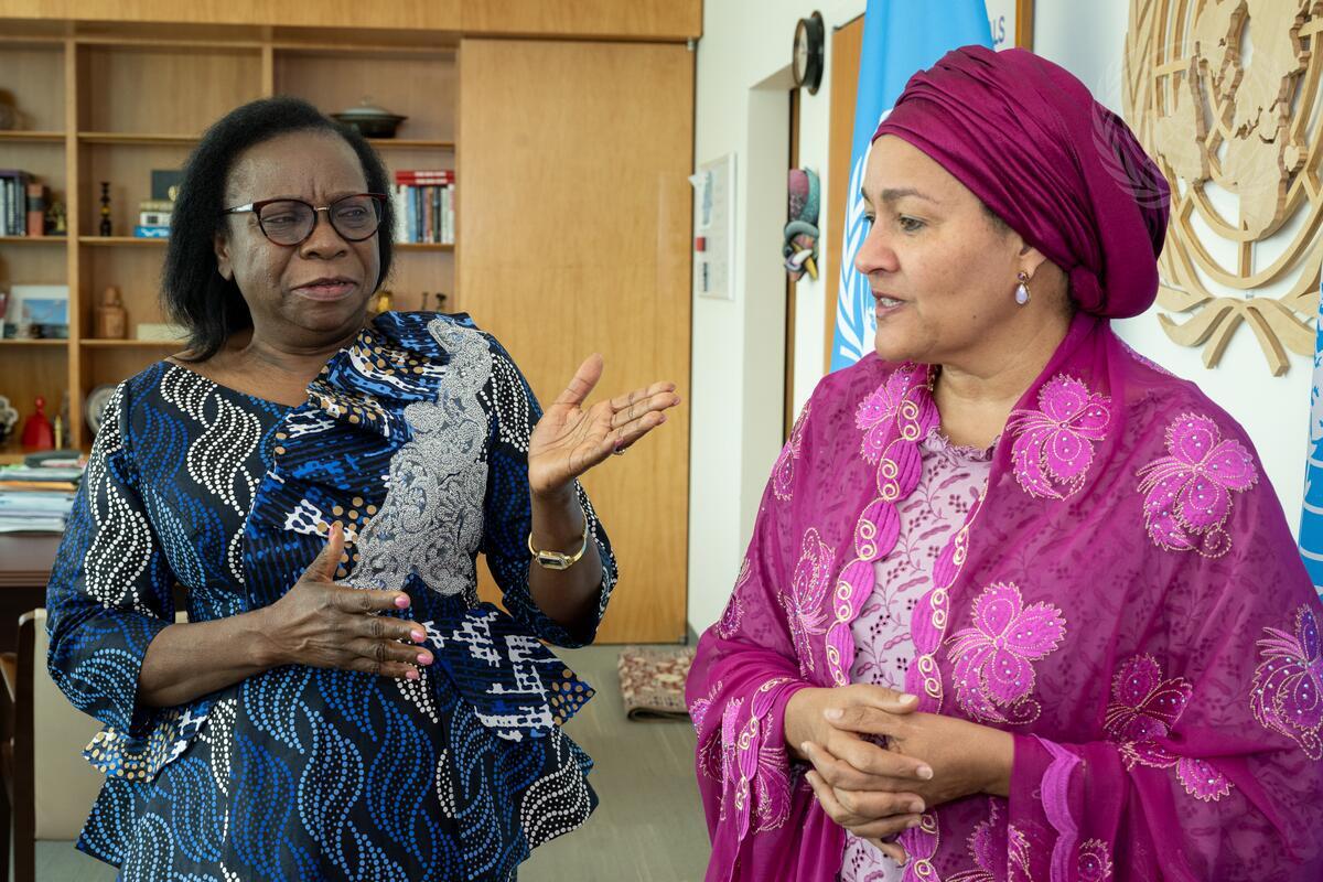 Deputy Secretary-General Amina Mohammed (right) meets with Mutale Nalumango, Vice President of the Republic of Zambia.