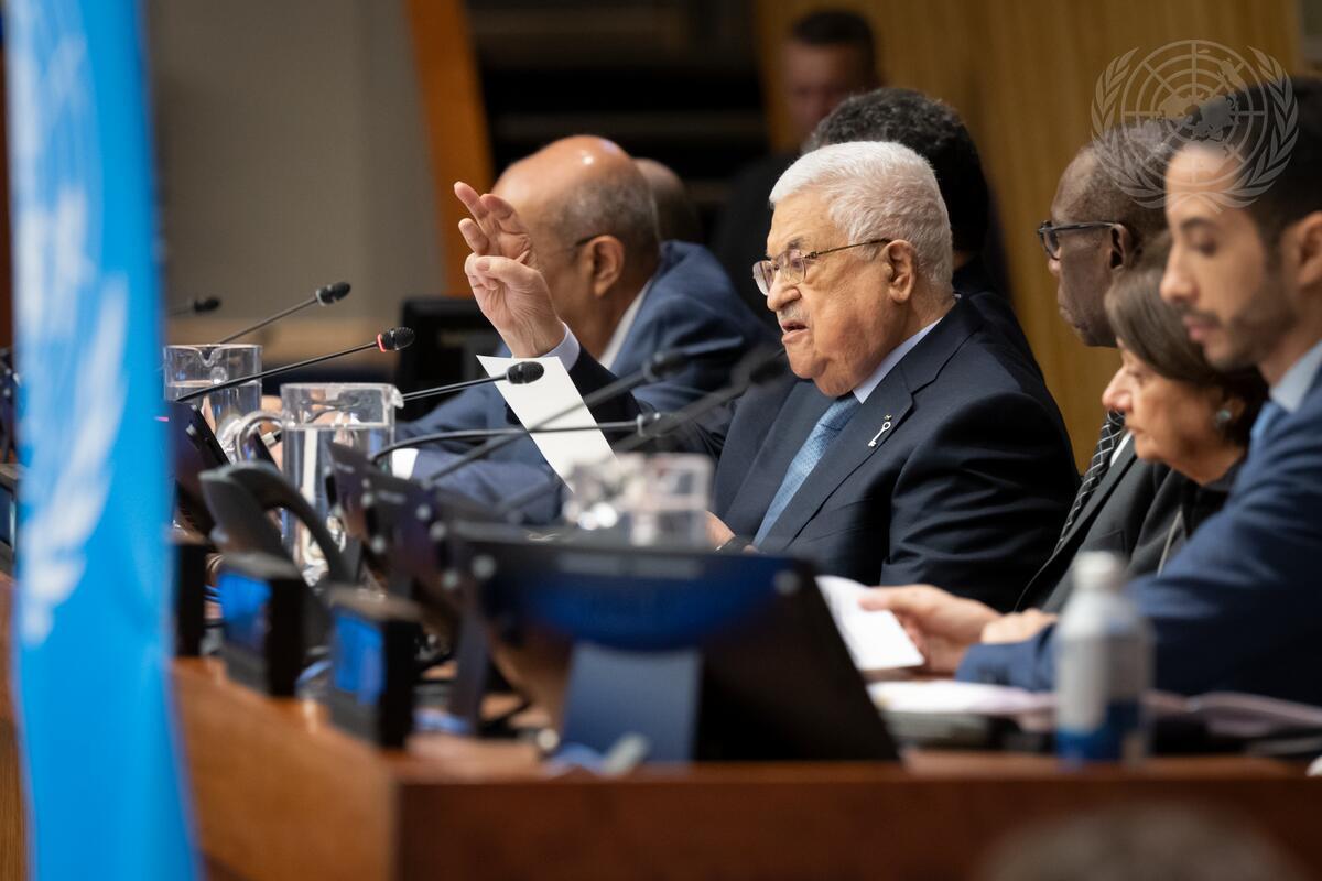 Mahmoud Abbas (second from left), President of the State of Palestine, addresses the event to commemorate the 75th Anniversary of the Nakba, held by the Committee on the Exercise of the Inalienable Rights of the Palestinian People.
