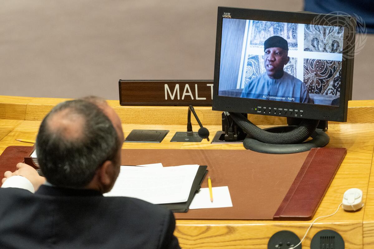 Bankole Adeoye (on screen), African Union Commissioner for Political Affairs, Peace and Security, briefs the Security Council meeting on the Sudan and South Sudan. The Council heard a report of the Secretary-General on the situation in the Sudan and the activities of the United Nations Integrated Transition Assistance Mission in the Sudan (UNITAMS).