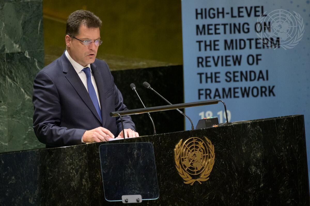 Janez Lenarčič, European Union Commissioner for Crisis Management, addresses the General Assembly high-level meeting on the Midterm Review of the Sendai Framework for Disaster Risk Reduction 2015-2030 on the theme: "Working Together to Reduce Risk for a Resilient Future". The plenary focused on “Charting liveable pathways for humans and nature”.