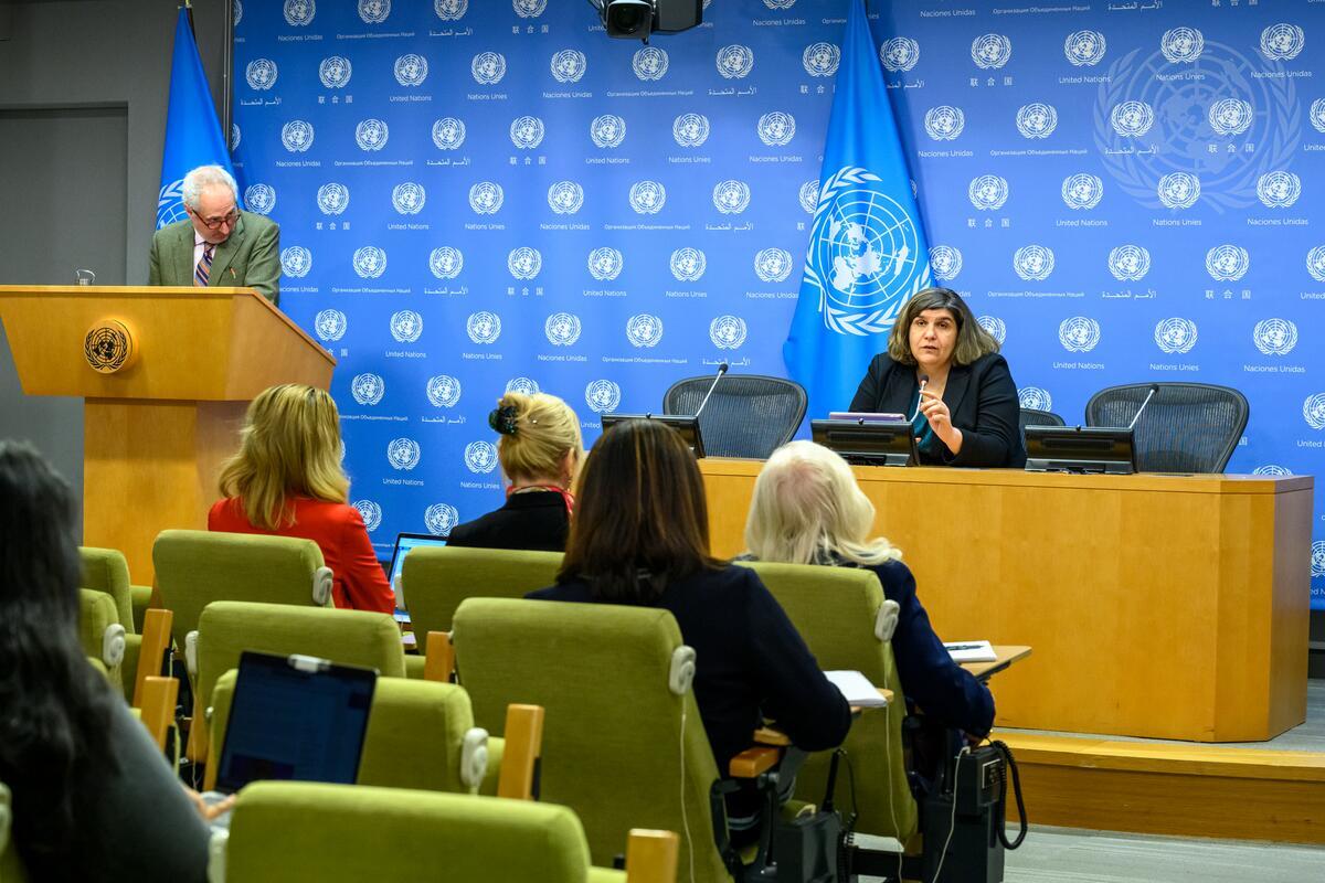 Lachezara Stoeva (seated at dais), President of the Economic and Social Council (ECOSOC) 2023 Session and Permanent Representative of the Republic of Bulgaria to the United Nations, briefs reporters at UN Headquarters. Standing at the podium is Stéphane Dujarric, Spokesperson for the Secretary-General.
