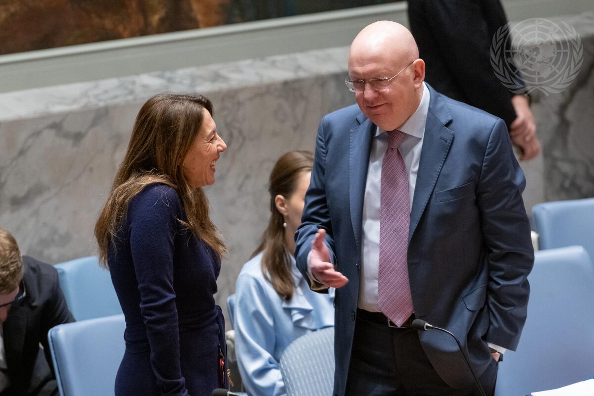 Vassily Nebenzia (right), Permanent Representative of the Russian Federation and President of the Security Council for the month of April, speaks with Vanessa Frazier, Permanent Representative of Malta to the United Nations, ahead of the Security Council meeting on the situation in Mali.