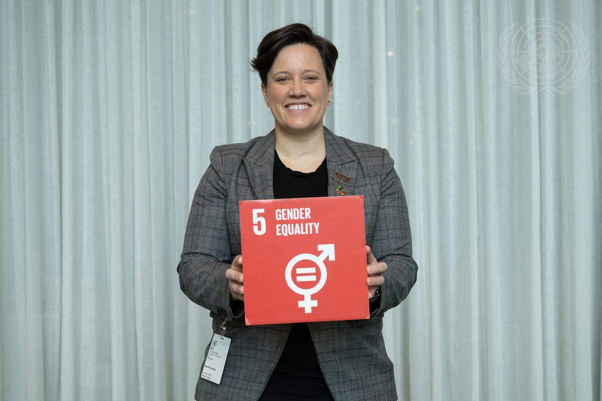 Sarah Axelson, Vice President for Advocacy of Women's Sports Foundation, poses for a photo with Sustainable Development Goal 5, Gender Equality, ahead of the event “International Day of Sport for Development and Peace 2023: Scoring for People and the Planet”.