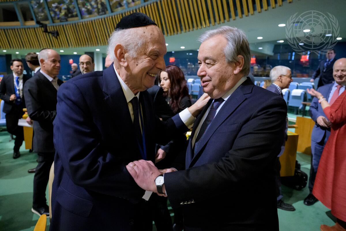 UN Secretary-General António Guterres (centre right) meets Rabbi Arthur Schneier, Senior Rabbi of Park East Synagogue, at the United Nations Observance of International Day of Commemoration in Memory of the Victims of the Holocaust under the theme “Home and Belonging”.