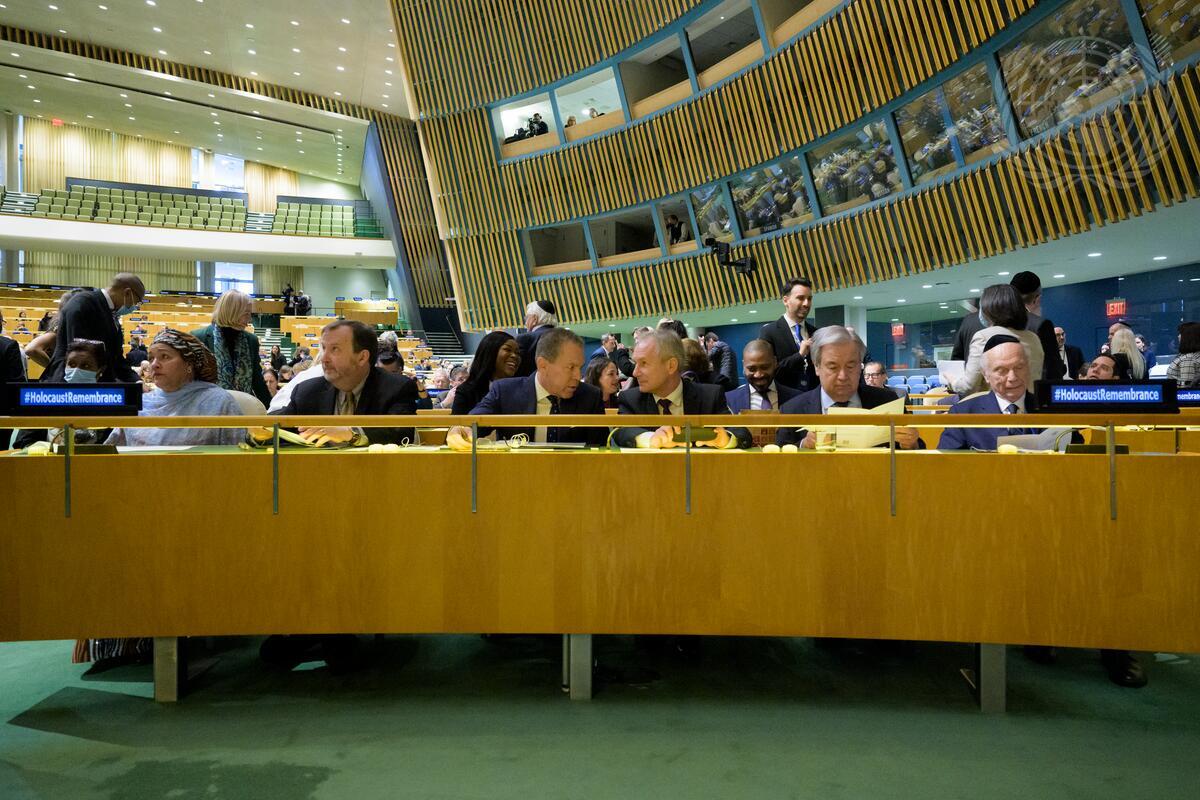 Attendees at the United Nations Observance of International Day of Commemoration in Memory of the Victims of the Holocaust under the theme “Home and Belonging”. From left to right are UN Deputy Secretary-General Amina Mohammed, Richard M. Mills, Jr., Deputy Permanent Representative of the United States of America to the UN, Gilad Erdan, Permanent Representative of Israel to the UN, Csaba Kőrösi, President of the seventy-seventh session of the UN General Assembly, UN Secretary-General António Guterres, and Rabbi Arthur Schneier, Senior Rabbi of Park East Synagogue.
