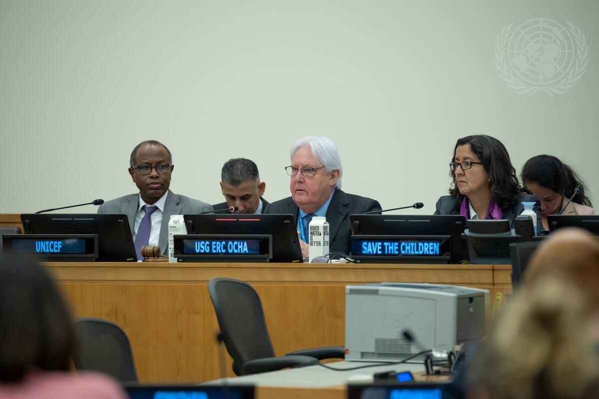 Martin Griffiths (centre), Under-Secretary-General for Humanitarian Affairs and Emergency Relief Coordinator, addresses a briefing on the Humanitarian Situation in Afghanistan organized by the UN Office for the Coordination of Humanitarian Affairs (OCHA).
