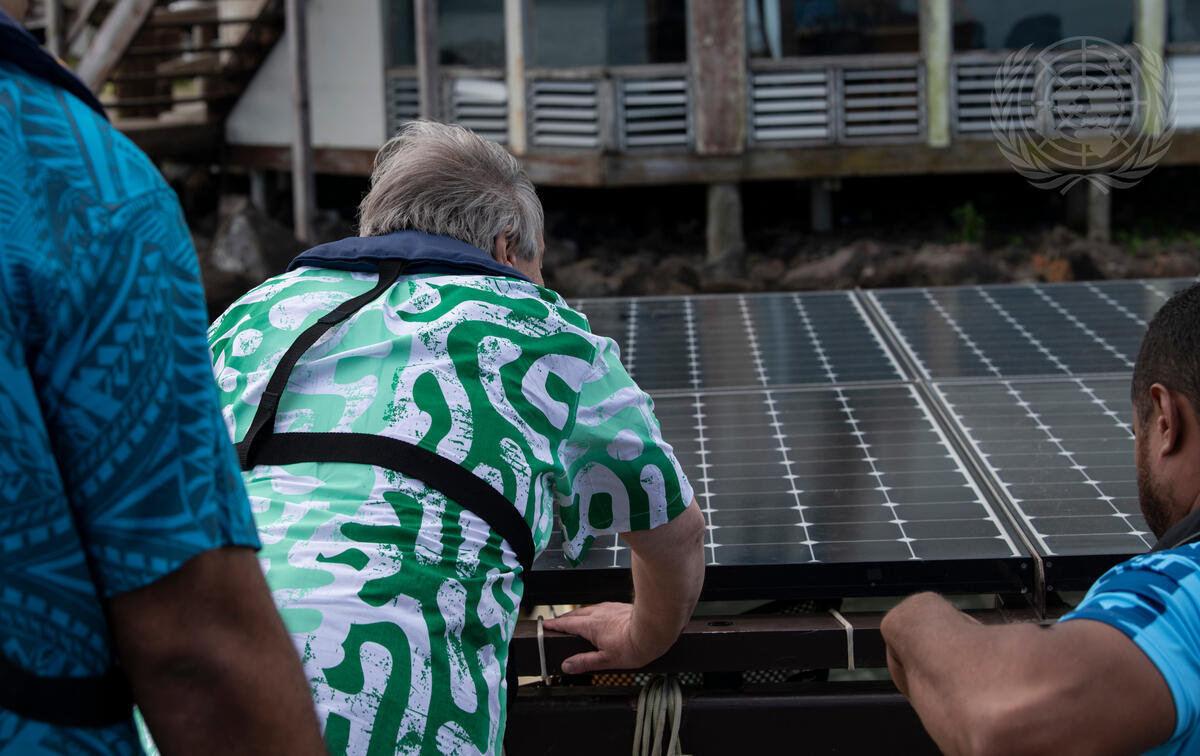 Secretary-General António Guterres (centre) studies the solar array on “Uto Ni Yalo”, a traditional Polynesian sailing canoe that with a solar-powered propulsion system. The boat is used to advocate for ocean conservation.