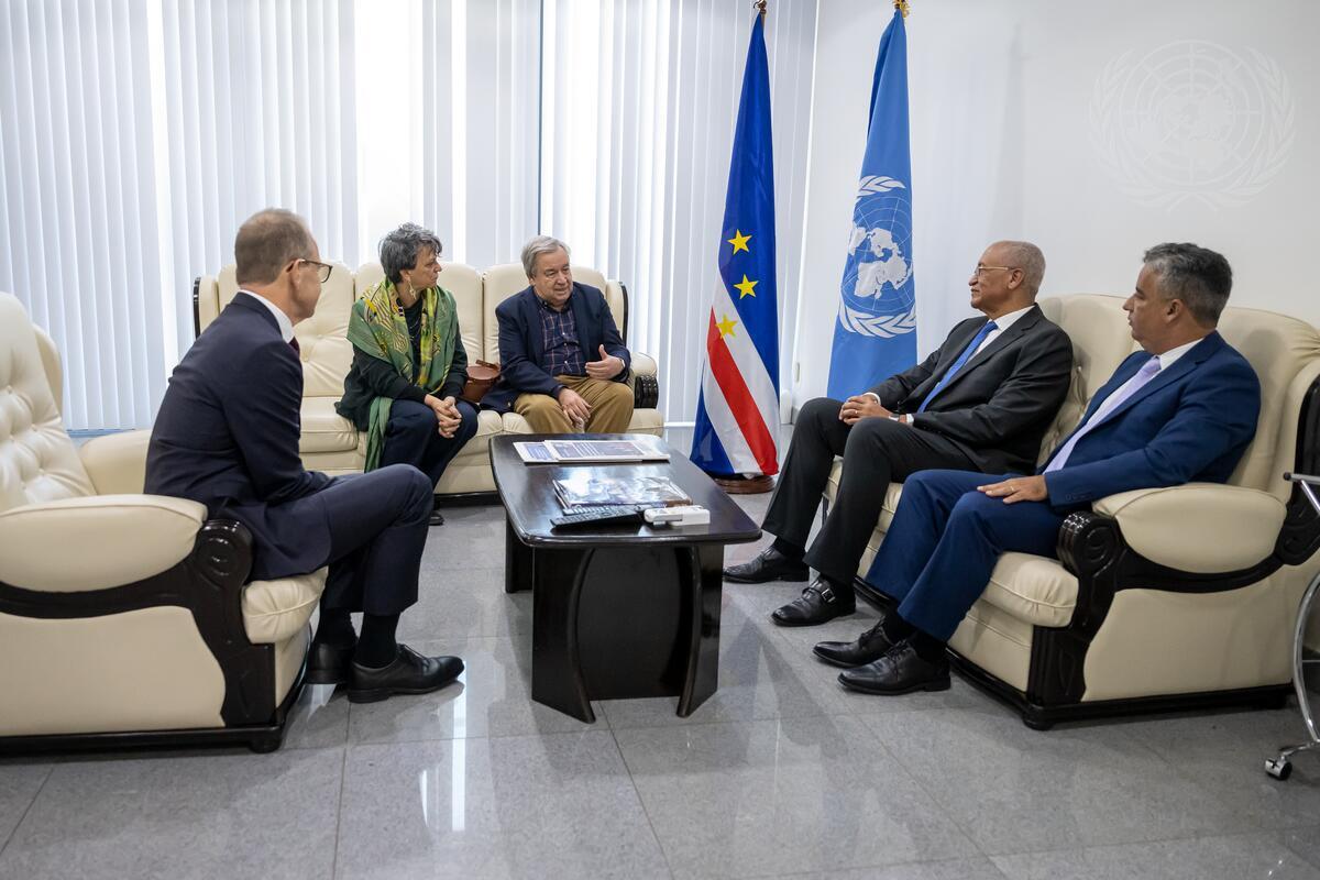 Secretary-General António Guterres (center) meets with Rui Alberto Figueiredo Soares (second from right), Minister of Foreign Affairs and Defense of the Republic of Cabo Verde, upon his arrival in São Vicente.