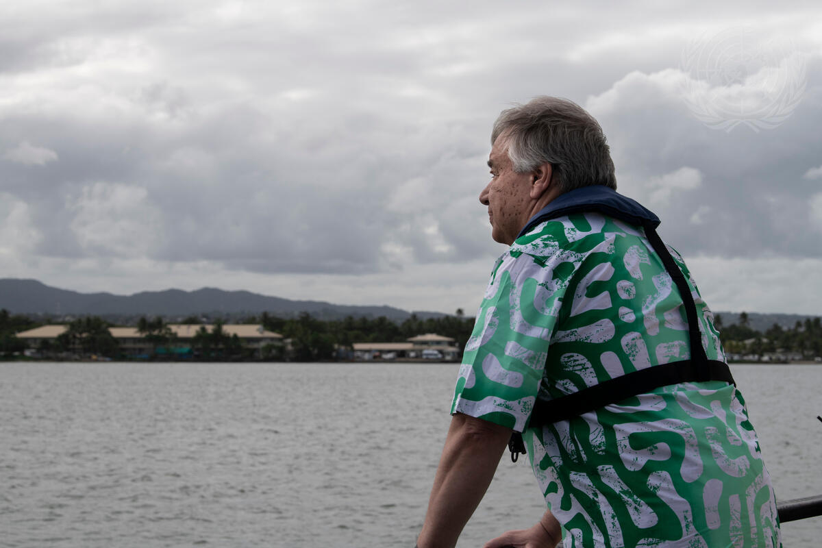 Secretary-General António Guterres takes an excursion on “Uto Ni Yalo”, a traditional Polynesian sailing canoe with a solar-powered propulsion system. The boat is used to advocate for ocean conservation.